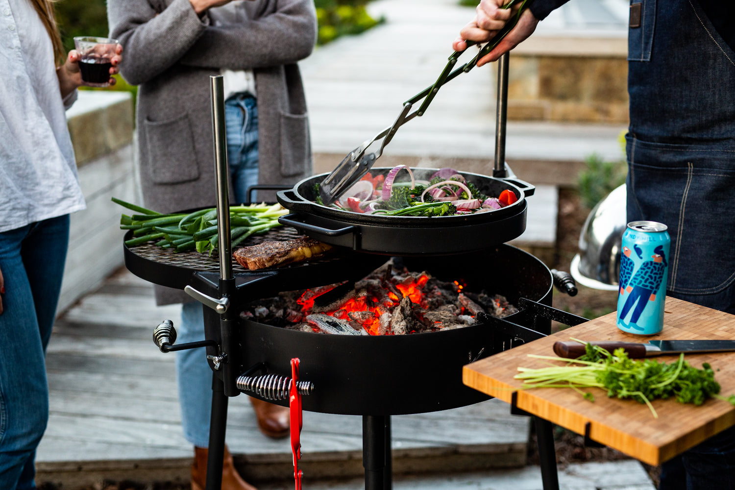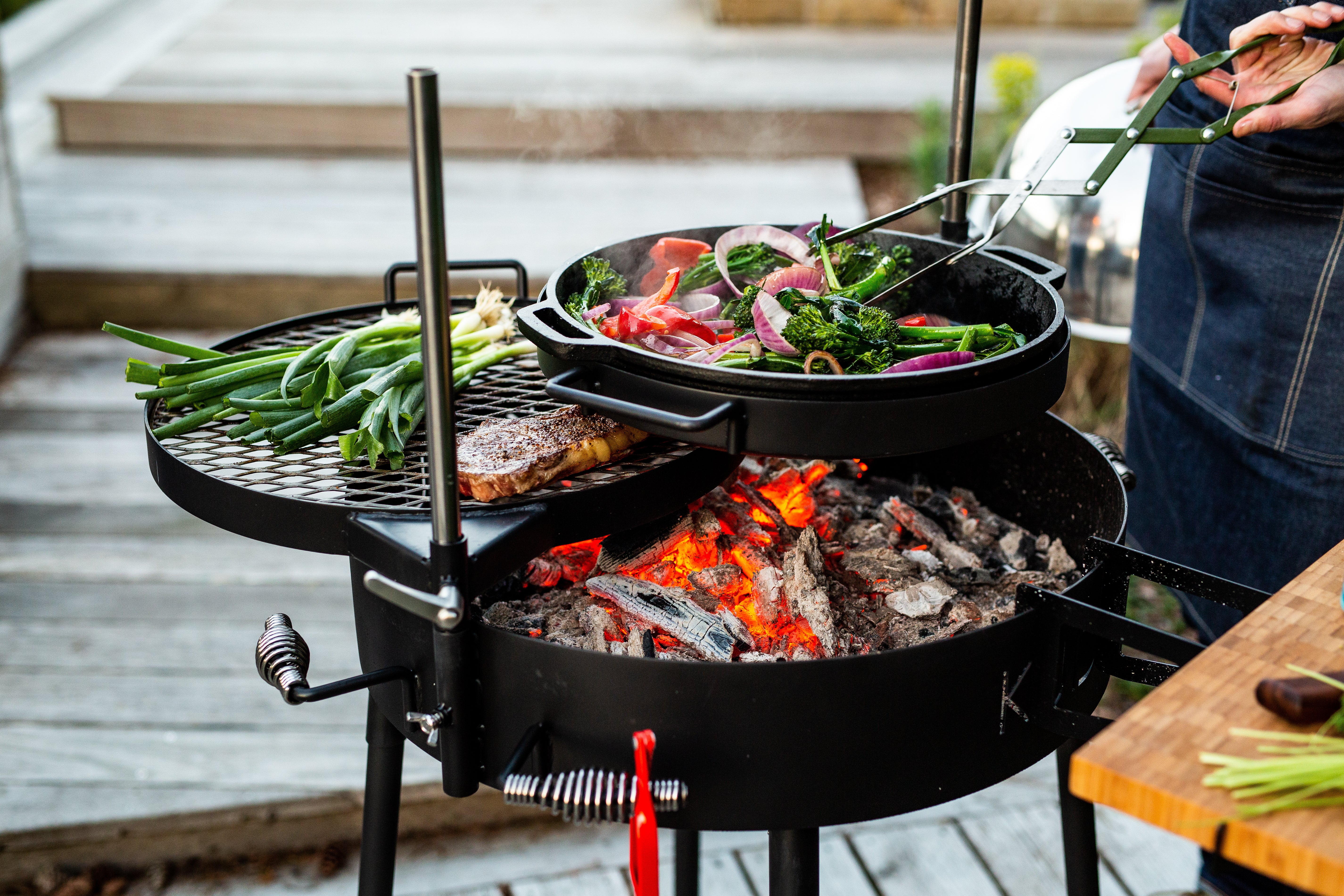 The KUDU Open Fire Grill’s smart, simplistic design allows you to cook over an open flame using your favorite lump charcoal, briquette, seasoned firewood or smoking wood. Easily adjust both cooking surfaces horizontally and vertically from high heat to low heat by raising the cast iron pan and grill grate away from the flame. The KUDU’s large flat fire pit lets you move the coals around freely, so you can create one large pile of embers or multiple smaller heat zones.
