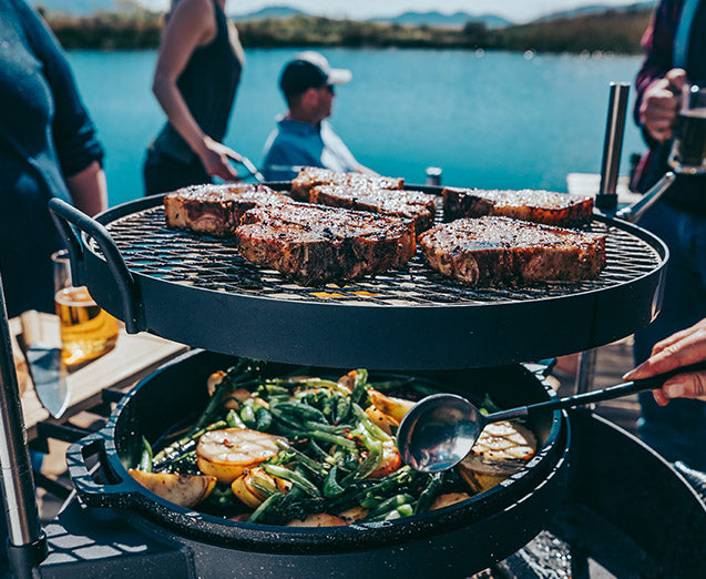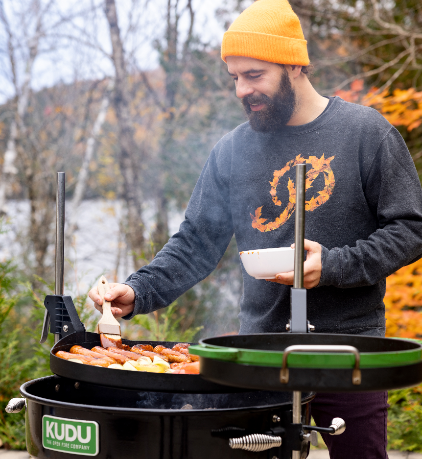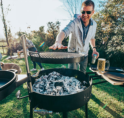 The KUDU Open Fire Grill’s smart, simplistic design allows you to cook over an open flame using your favorite lump charcoal, briquette, seasoned firewood or smoking wood. Easily adjust both cooking surfaces horizontally and vertically from high heat to low heat by raising the cast iron pan and grill grate away from the flame. The KUDU’s large flat fire pit lets you move the coals around freely, so you can create one large pile of embers or multiple smaller heat zones.